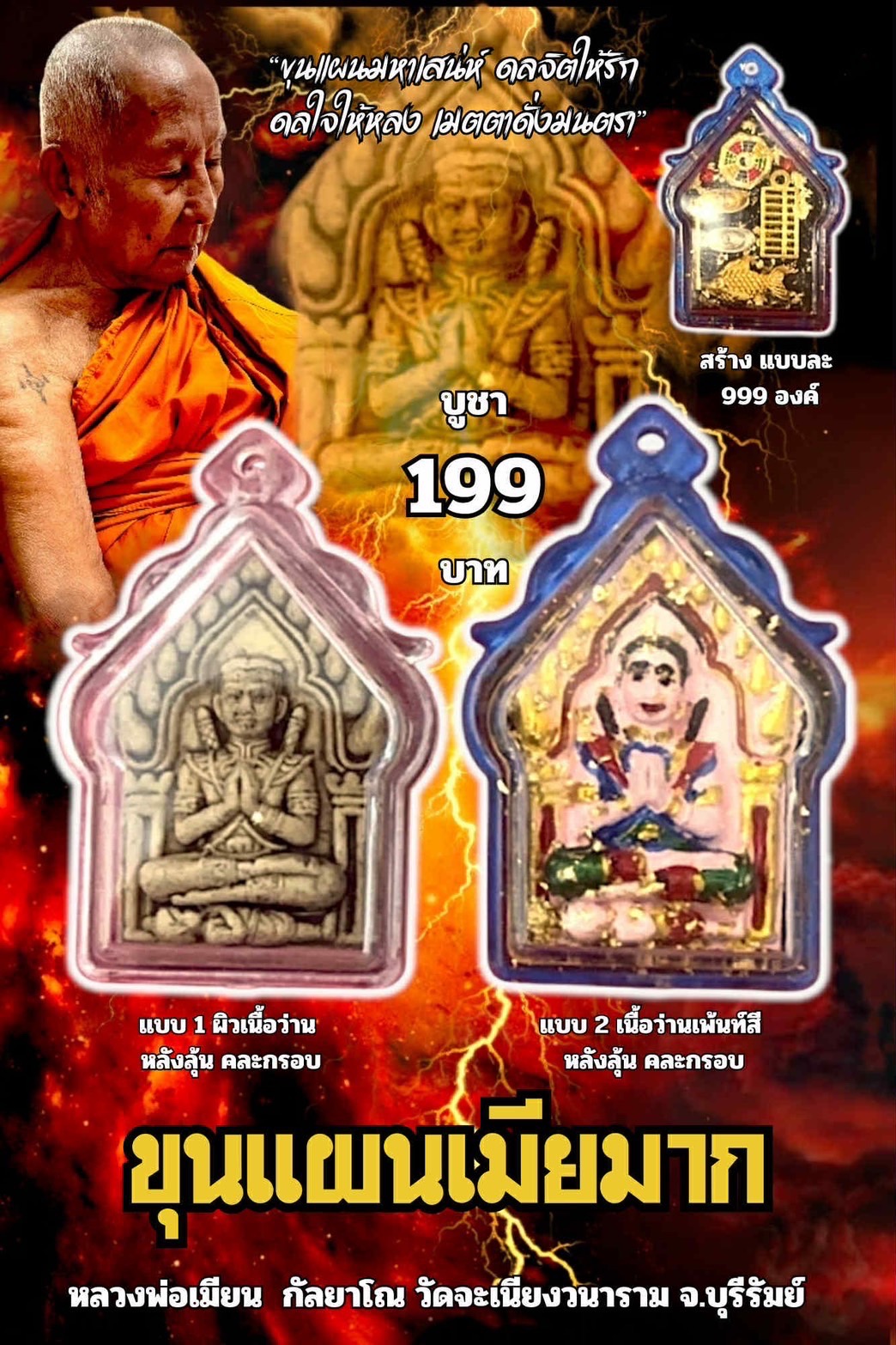 หลวงพ่อเมียน วัดบ้านจะเนียงวนาราม จ.บุรีรัมย์ ขุนแผนเมียมาก พร้อมเลี่ยมกรอบ ราคาจอง 199 บาท จัดสร้าง อย่างละ 999 องค์ มีรายการดังนี้ ผิวเนื้อว่าน หลังลุ้น คละกรอบ เนื้อว่านเพ้นท์สี หลังลุ้น คละกรอบ รับพระเดือนธันวาคม มีเลขโค้ดกำกับทุกองค์ วัตถุประสงค์:ร่วมพัฒนาวัดบ้านจะเนียงวนาราม จ.บุรีรัมย์