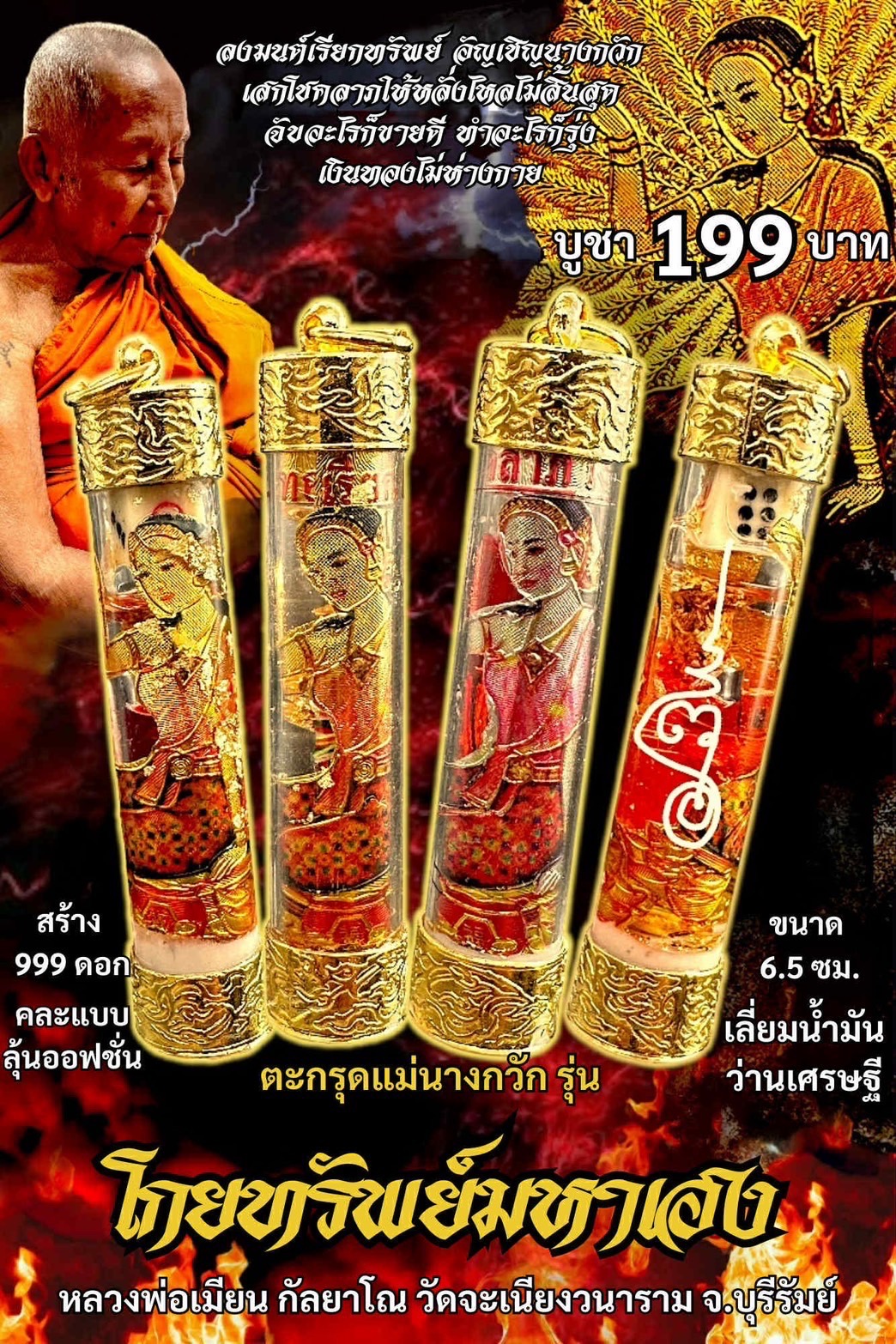 หลวงพ่อเมียน วัดบ้านจะเนียงวนาราม ตะกรุดแม่นางกวัก รุ่น โกยทรัพย์มหาเฮง พร้อมเลี่ยมน้ำมันว่านเศรษฐี ราคาจอง 199 บาท จัดสร้าง 999 ดอก ขนาด6.5ซม.(ใหญ่) คละแบบลุ้น option รับพระเดือนธันวาคม มีเลขโค้ดกำกับทุกองค์ วัตถุประสงค์:ร่วมพัฒนาวัดบ้านจะเนียงวนาราม จ.บุรีรัมย์