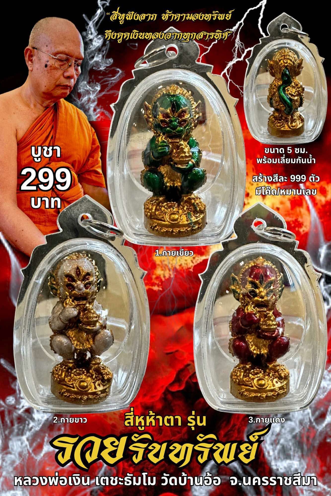 หลวงพ่อเงิน วัดบ้านอ้อ นครราชสีมา สี่หูห้าตา รุ่น รวยรับทรัพย์ พร้อมเลี่ยมกรอบกันน้ำ ราคาจองเพียง 299 บาท จัดสร้าง อย่างละ 999 ตัว ขนาด5ซม.(ใหญ่) มีรายการดังนี้ กายเขียว กายขาว กายแดง รับพระเดือนธันวาคม วัตถุประสงค์ ร่วมพัฒนา วัดบ้านอ้อ มีหมายเลขกำกับทุกองค์