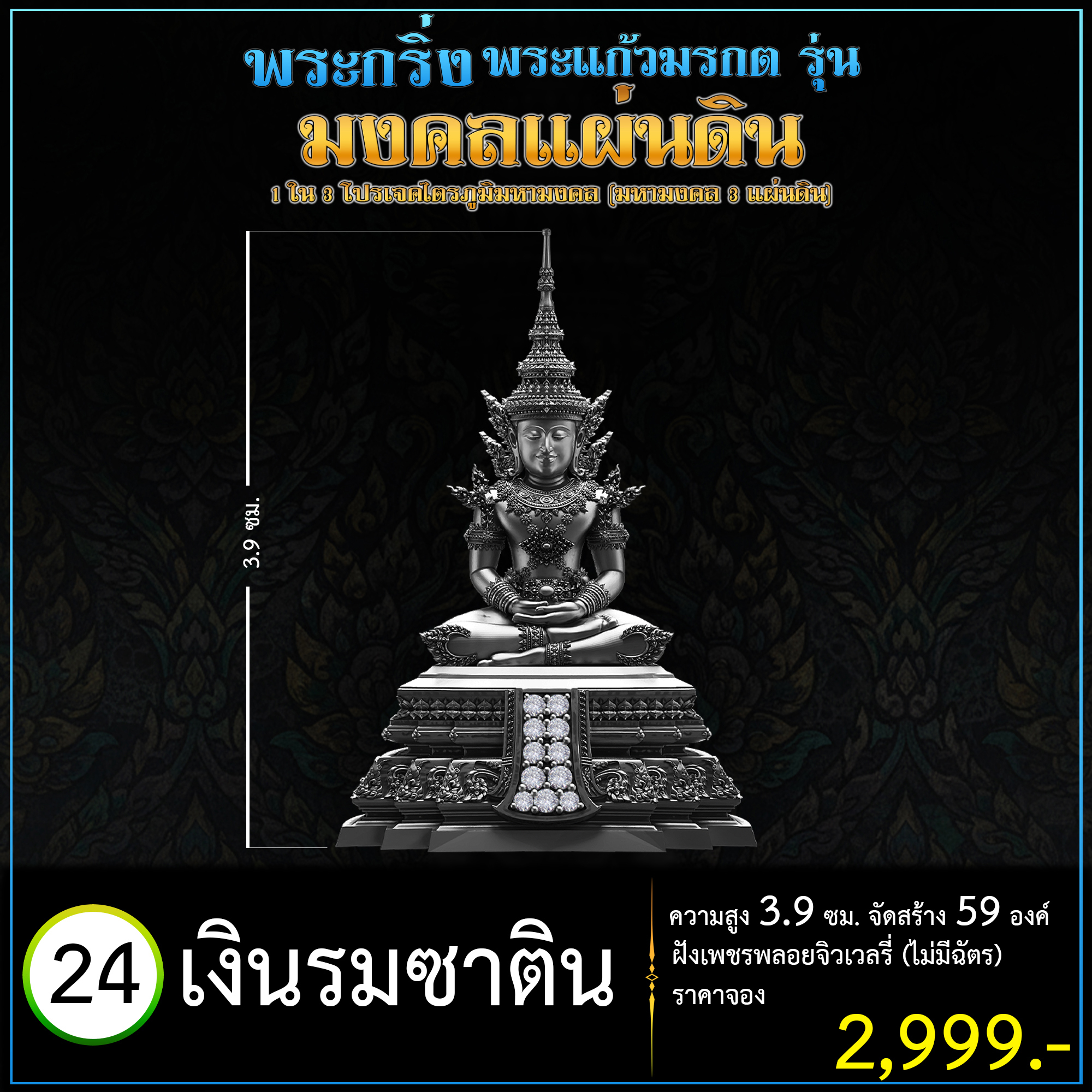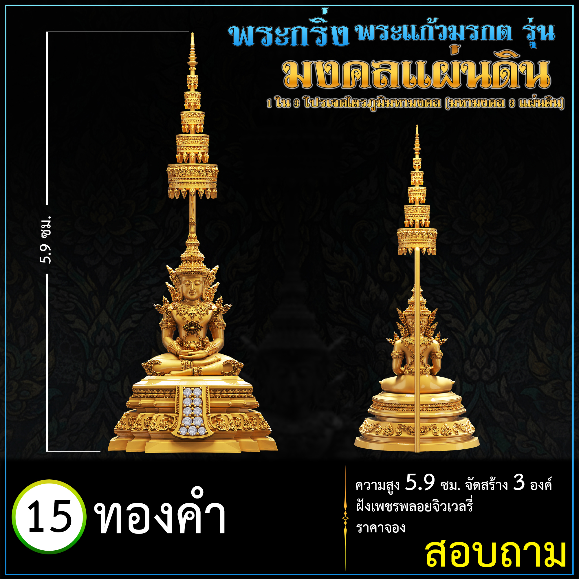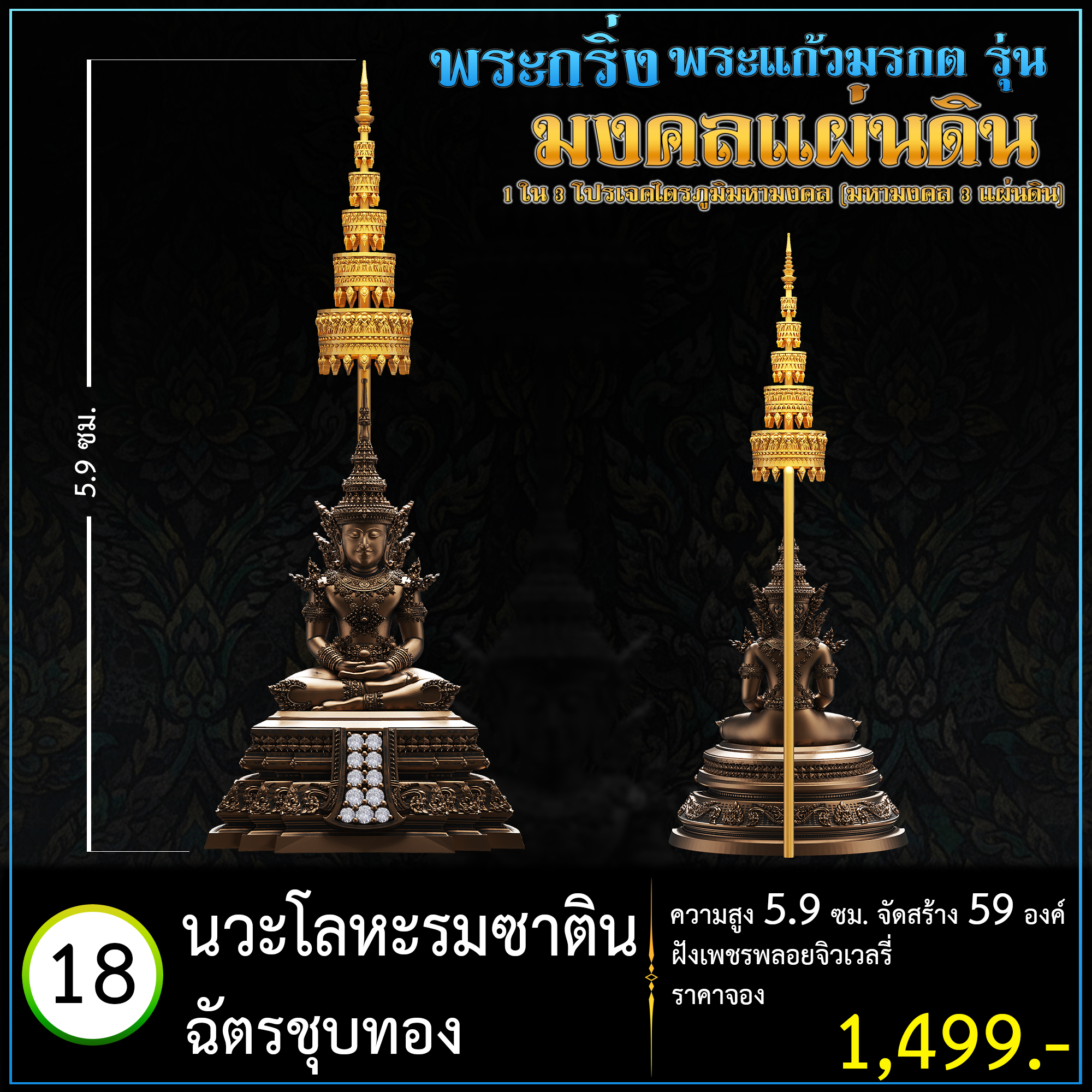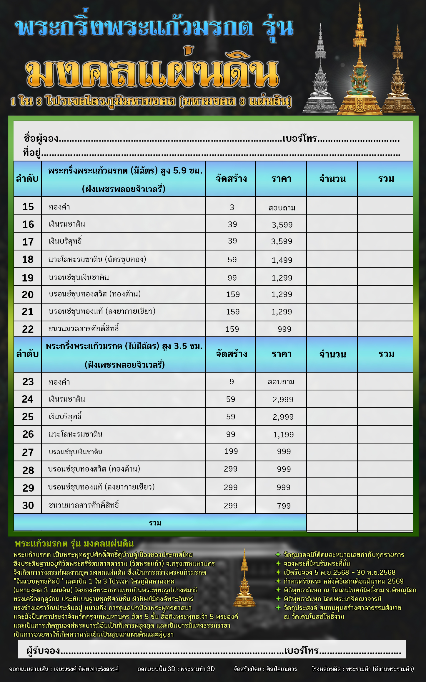 พระแก้วมรกตพุทธศิลป์ รุ่น มงคลแผ่นดิน (ขนาดบูชา) หน้าตัก 5 นิ้วฝังเพชร 1 ใน 3 โปรเจค ไตรภูมิมหามงคล (มหามงคล 3 แผ่นดิน) มหามงคลชุดสุดท้ายแห่งเมืองหลวง "กรุงเทพมหานคร) งานหล่อพุทธศิลป์คุณภาพระดับงานจิวเวลรี่พรีเมี่ยม เป็นเทคโนโลยีที่หล่อสวยงามคมชัดที่สุดในปัจจุบัน 1 ใน 3 โปรเจค ไตรภูมิมหามงคล (มหามงคล 3 แผ่นดิน) หลวงพ่อโสธร มงคลแห่งเมืองแปดริ้ว (ฉะเชิงเทรา) พระพุทธชินราช มงคลแห่งเมืองสองแคว (พิษณุโลก) พระแก้วมรกต มงคลแห่งเมืองหลวง (กรุงเทพมหานคร) พระแก้วมรกต รุ่น มงคลแผ่นดิน พระแก้วมรกต เป็นพระพุทธรูปศักดิ์สิทธิ์คู่บ้านคู่เมืองของประเทศไทย ซึ่งประดิษฐานอยู่ที่วัดพระศรีรัตนศาสดาราม (วัดพระแก้ว) จ.กรุงเทพมหานคร จึงเกิดการรังสรรค์ผลงานชุด มงคลแผ่นดิน ซึ่งเป็นการสร้างพระแก้วมรกต "ในแบบพุทธศิลป์" และเป็น 1 ใน 3 โปรเจค ไตรภูมิมหามงคล (มหามงคล 3 แผ่นดิน) การออกแบบ โดยองค์พระออกแบบเป็นพระพุทธรูปปางสมาธิ ทรงเครื่องฤดูร้อน ประทับบนฐานชุกชีสามชั้น ผ้าทิพย์มีองค์พระอินทร์ทรงช้างเอราวัณประดับอยู่ หมายถึง การดูแลปกป้องพระพุทธศาสนา และยังเป็นตราประจำจังหวัดกรุงเทพมหานคร ฉัตร 5 ชั้น สื่อถึงพระพุทธเจ้า 5 พระองค์ เป็นการเทิดทูนองค์พระบารมีอันเป็นที่เคารพสูงสุด และเป็นบารมีแห่งธรรมราชา เป็นการอวยพรให้เกิดความร่มเย็นเป็นสุขแก่แผ่นดินและผู้บูชา ขนาดการจัดสร้าง ขนาดหน้าตัก 5 นิ้ว (ฝังเพชรพลอยจิวเวลรี่) / หน้าตัก 3 นิ้ว / หน้าตัก 1.5 นิ้ว วัตถุประสงค์ในการจัดสร้าง เพื่อสบทบทุนร่วมสร้างศาลาธรรมสังเวช ณ วัดเด่นโบสถ์โพธิ์งาม พิธีพุทธาภิเษก โดยพระเกจิคณาจารย์ เปิดจองวันที่ 5 พ.ย.2568 - 30 พ.ย.2568 รับผลงานหลังพิธีเสกใหญ่ ช่วงเดือน มีนาคม 2568 ออกแบบลายเส้นโดย เจนณรงค์ ทิพยเทวะรังสรรค์ ออกแบบปั้น 3D โดย พระรามห้า 3D โรงหล่อผลิตโดย โรงหล่อพระรามห้า (ดีงามพระรามห้า) ดำเนินการจัดสร้างโดย ศิลป์คเณศวร #ขวัญพระเครื่อง #ขวัญธานันท์พระเครื่อง