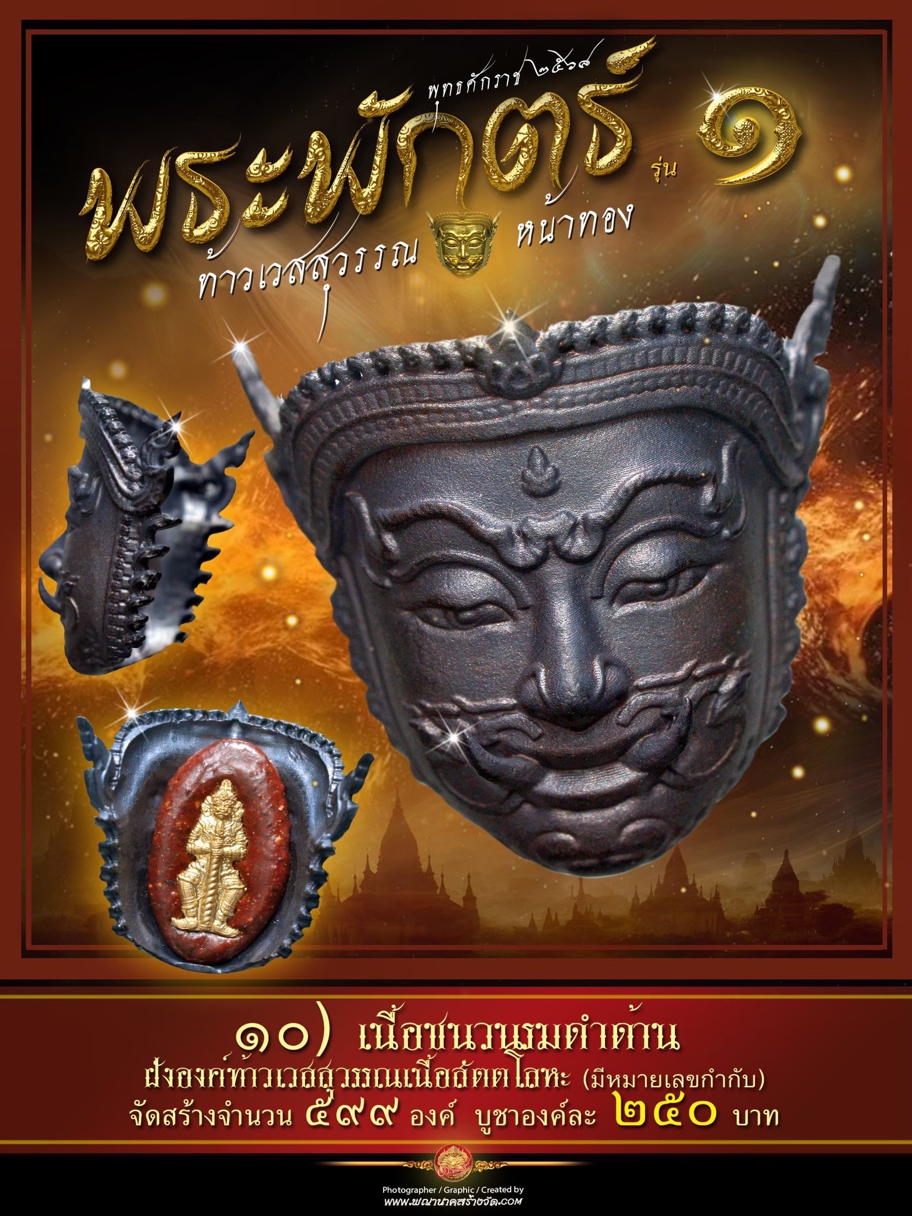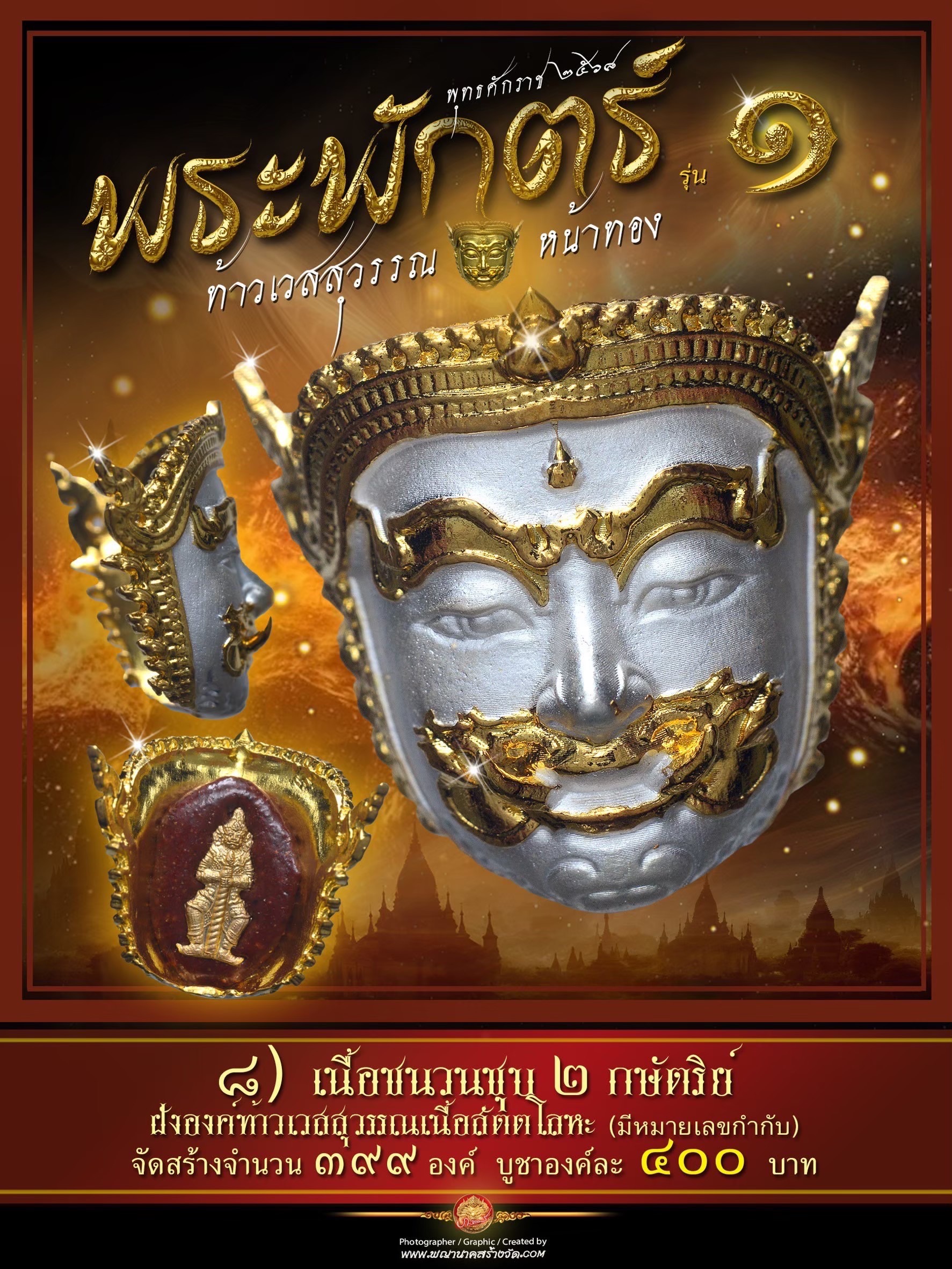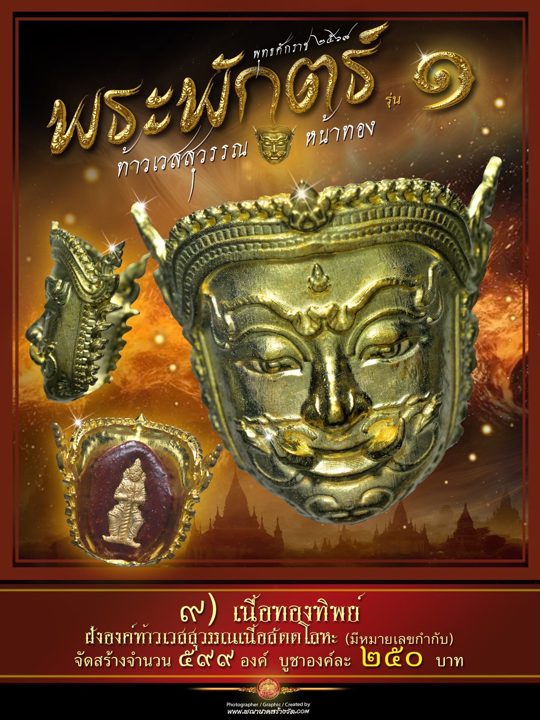 จัดสร้างครั้งแรก พระพักตร์ท้าวเวสสุวรรณหน้าทอง รุ่น ๑ พุทธศักราช ๒๕๖๘ บรรจุผงพุทธคุณ ประทับหลังองค์ท้าวเวสสุวรรณ อธิษฐานจิตครบ ๑ ปีเต็ม ผู้ใดได้เห็นเป็นที่สุดแห่ง นะ เมตตา จัดสร้างโดย อุทยานท้าวเวสสุวรรณโณ หลวงพ่ออิฏฐ์ อุปถัมภ์ จ.นครปฐม วัตถุประสงค์ สมทบทุนมูลนิธิสรรพราเชนทร์ เพื่อการศึกษาทุนนักเรียนเรียนดี ประพฤติดี แต่ขาดทุนทรัพย์ เข้าพิธีอธิษฐานจิตครั้งสุดท้าย ๓๐ พ.ย. รับพระวันที่ ๒ ธ.ค. ๖๘