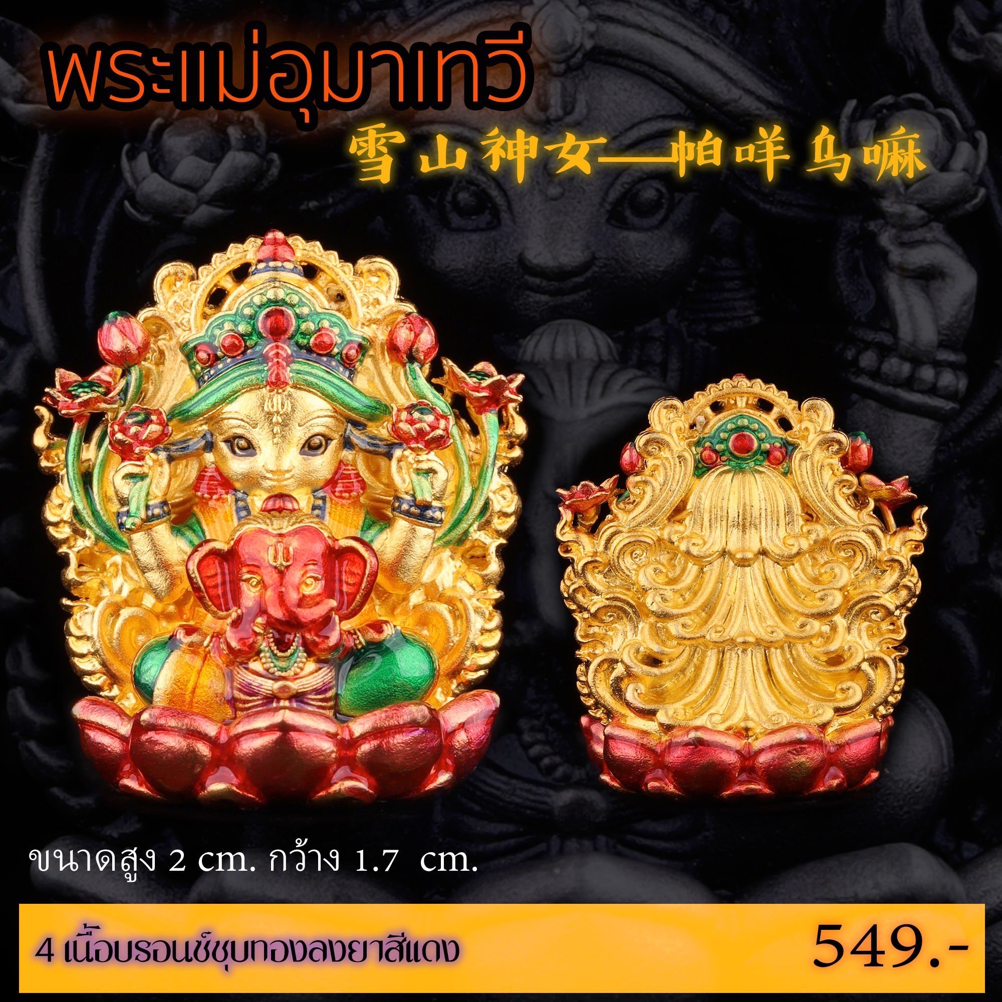 พระแม่อุมาเทวี ขนาดความสูง 2 CM กว้าง 1.7 CM. เนื้อบรอนซ์ชุบทอง ลงยาสีแดง